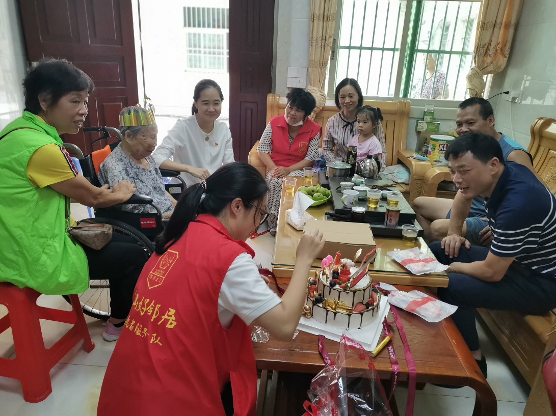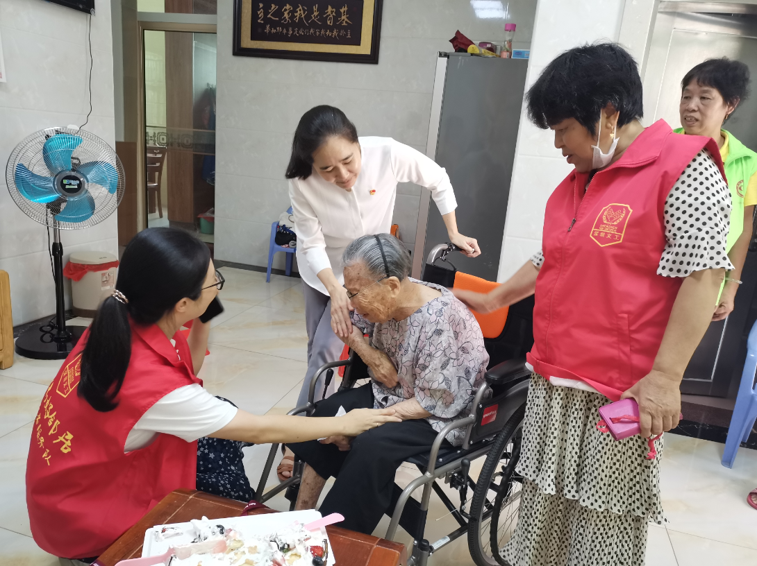 黃阿婆耳朵聽不清,大家圍坐在黃阿婆周圍,俯身聽阿婆聊家常,悉心回應着。袁利環親切地問候黃阿婆,了解其生活、身體狀況,叮囑其家人照顧好老人的生活。伴隨着點亮的生日燭光,「坪山好鄰居」銀齡志願服務隊帶領全場為黃阿婆唱起了生日快樂歌,阿婆流下了幸福的淚水。