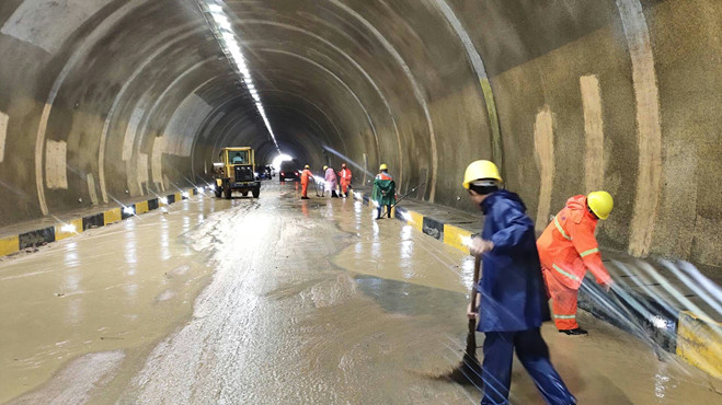 由於當晚雨太大,隧道口的泥石流不斷下泄,為保障安全,經區現場指揮領導同意,立即切斷隧道供電,並由區交警設置標牌標誌封閉該隧道通行。