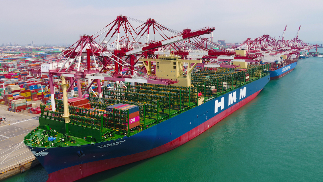 4月26日,載箱量2.4萬標準箱的全球首艘最大集裝箱班輪—THE聯盟“HMM阿爾赫西拉斯”輪首航山東港口 山東港口供圖