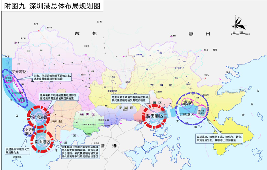 其中,深圳東部港區是天然良港,水域較為寬敞,有良好的自然水深條件,障礙物少,以天然航道為主,人工航道較短;主要停靠的是集裝箱船舶和LNG船舶,可停靠世界上最大的20萬噸級集裝箱船舶。深圳港西部港區位於珠江口內伶仃洋東岸,水域較為狹窄,通航水域緊缺,深水錨地少,航道多為人工開挖,寬度較小,其水路交通網絡四通八達。西部水域現有9個錨地,主要供進出港船舶候泊、聯檢、引航、裝卸貨物和防颱之用。目前,深圳港已建成西部包括南山港區、大鏟灣港區、大小鏟島港區、寶安港區4個港區,東部包括鹽田港區、大鵬港區2個港區。其中,鹽田港區、南山港區、大鏟灣港區3個港區是集裝箱運輸的重點港區。