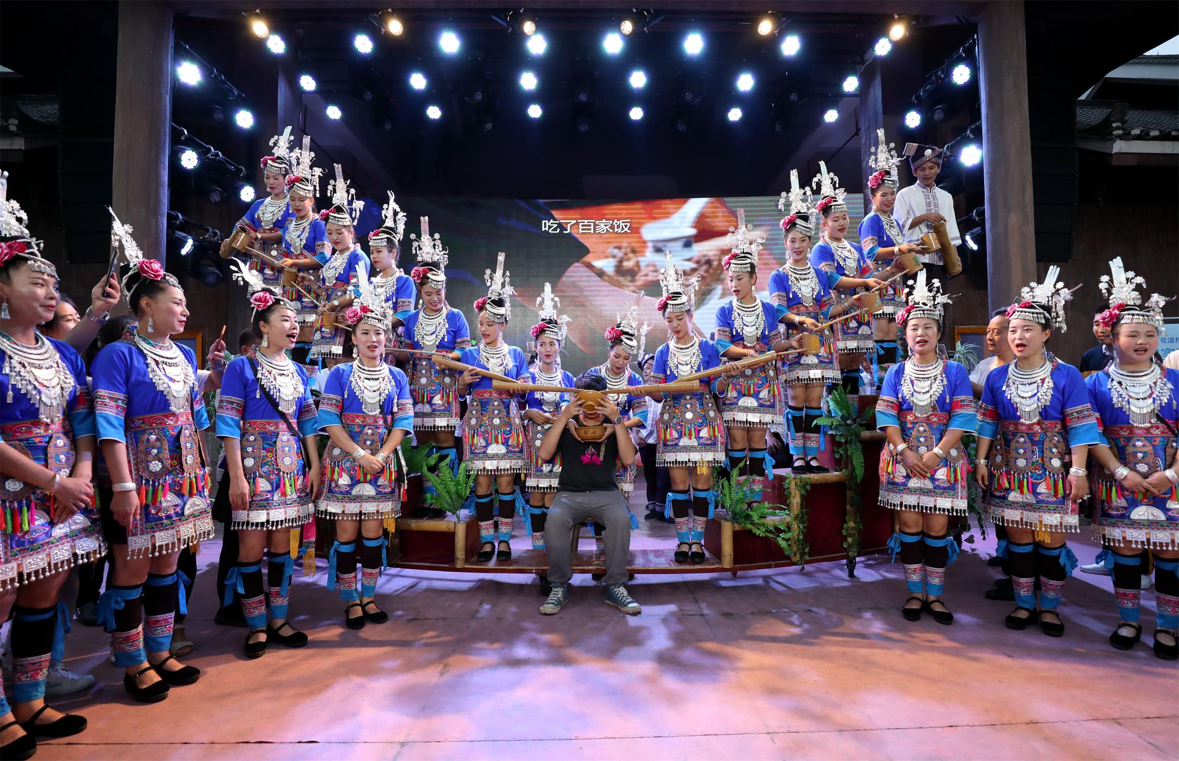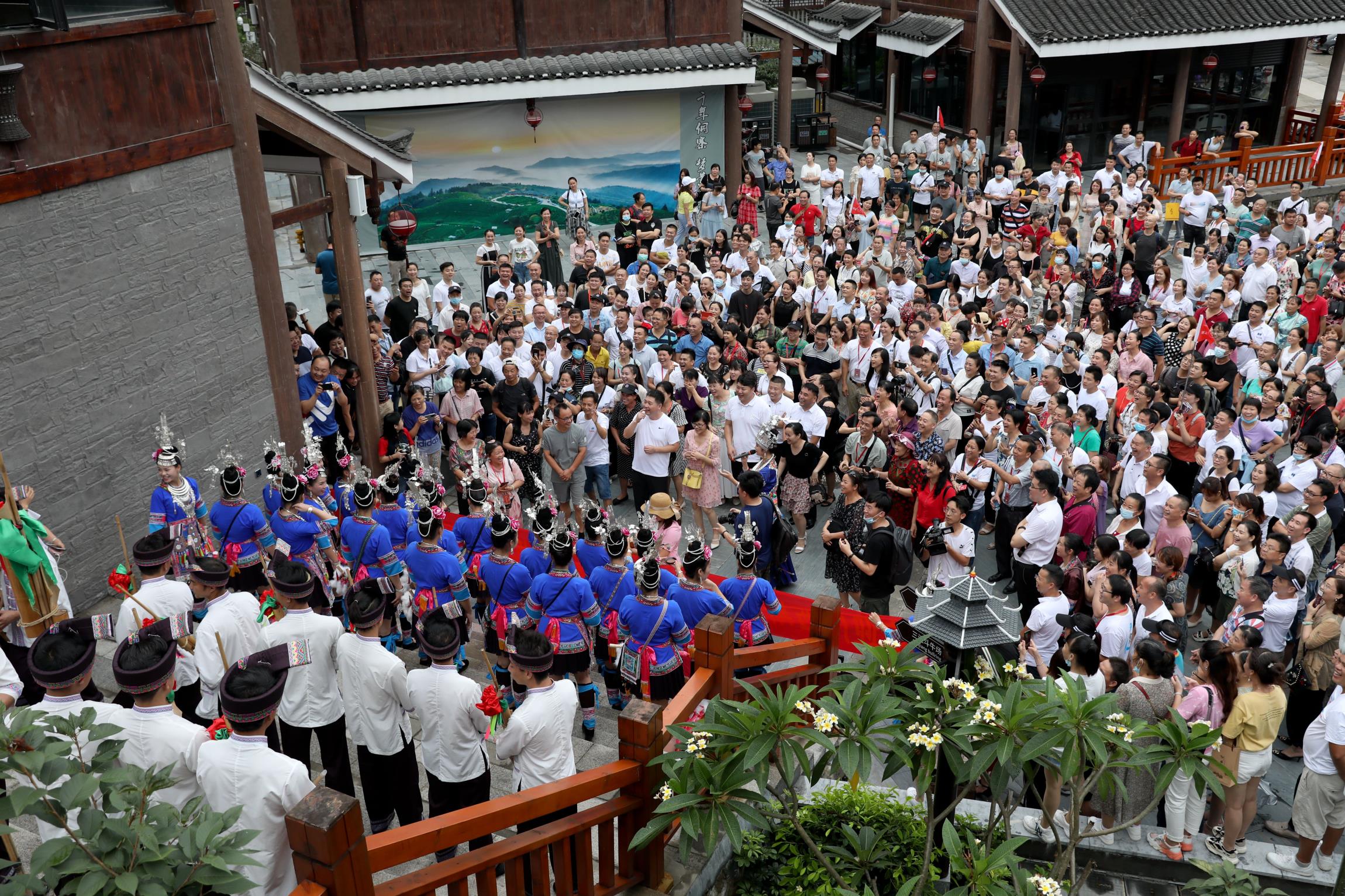 在三江侗族自治縣侗鄉鳥巢,人們在攔路迎賓