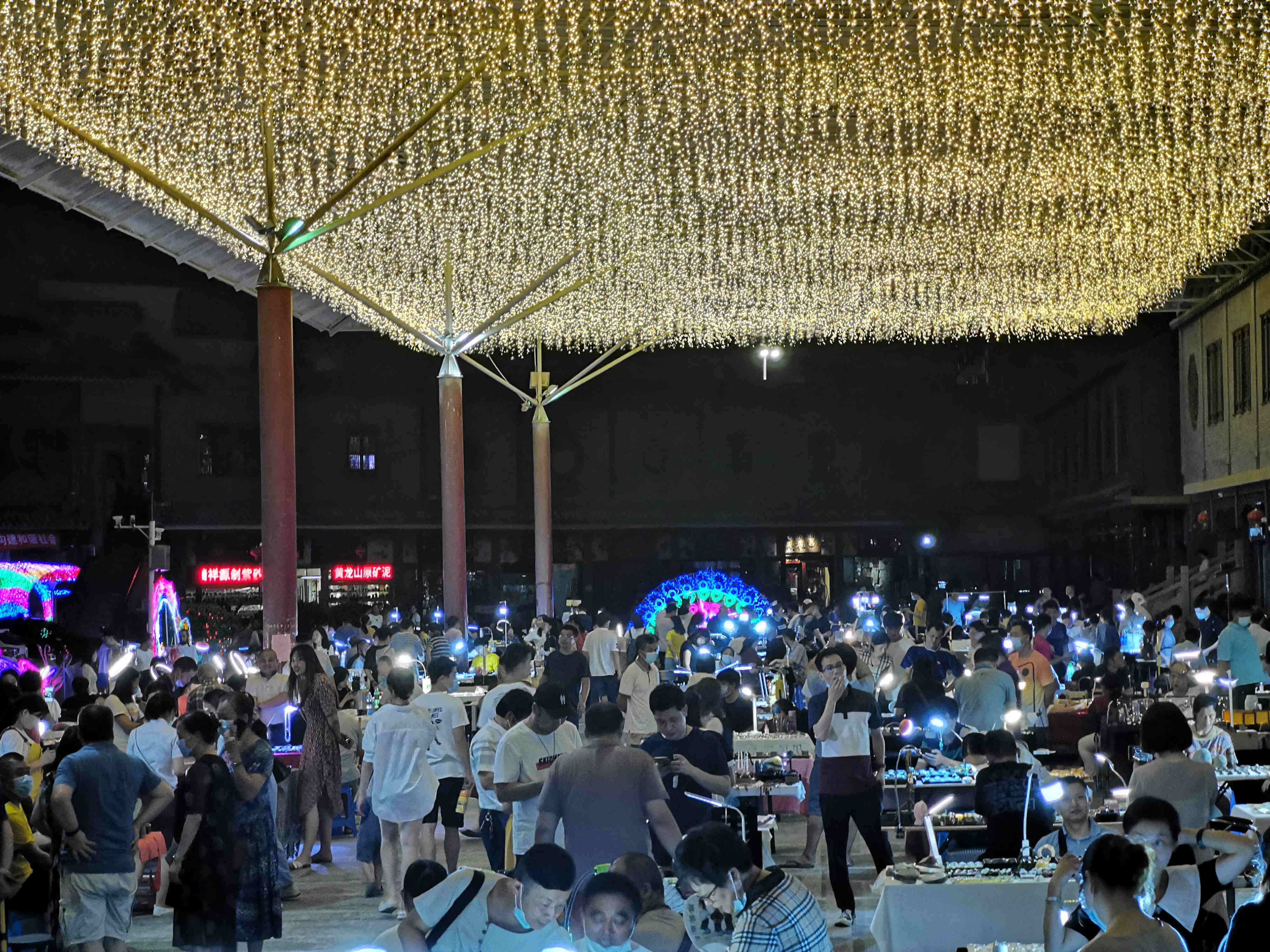 盛夏蟬鳴的夜晚,溫柔的晚風吹落一地星辰,在燈光璀璨的夜市之中,珠光寶氣如夢如幻,人間煙火溫暖纏綿,累了一天的人們在這裏慢慢散著步,愛人在人潮之中相互依偎,女生為同伴挑選心儀的首飾,父親蹲下身子為稚兒拍照,在夏風沉醉的夜晚,有人站在橋上,拍下了這燈火通明的市井。