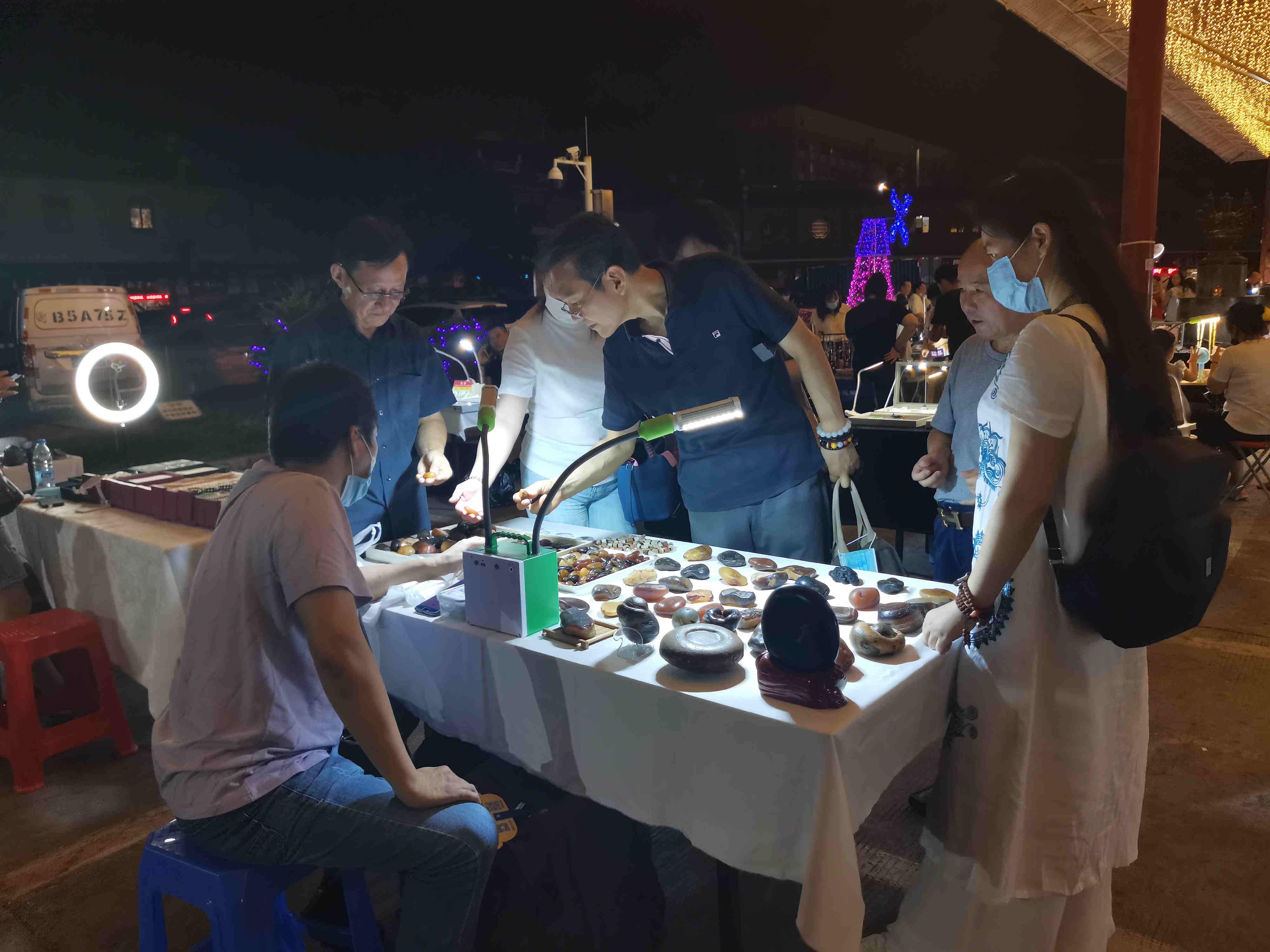 夜市之中,翡翠、和田玉、蜜蠟、南紅、琥珀……比比皆是,形狀各有特色的吊墜,顏色繽紛晶瑩的手鐲,雕琢夢蝶圖案的玉佩……中式翡翠珠寶玉器的美麗,乍然綻放。拿起一個葫蘆形狀的吊墜,略覺可愛,攤主會告訴你葫蘆圖案在我國文化中的寓意。試戴一串色彩斑斕的手串,攤主會跟你講起這類手串的材質。一個瓷器中放著許多的小玉石原料,看著不起眼,攤主拿燈給你照著手上的這顆小玉石,讓你瞭解它的通透度。
