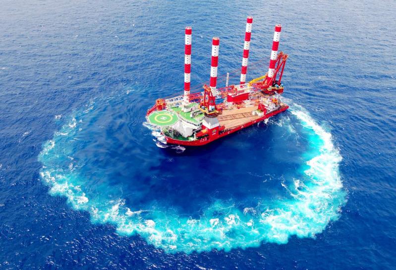 該船四條筆直修長的大長腿高90米,配有4套液壓插銷式雙動環梁升降系統和沖樁系統,單樁最大舉升能力5600噸。「華祥龍」依靠自身DP2在海上精準定位後,就能靠樁腿牢牢站立在海上作業點,作業水深(包括潮差)可達50米。與常規工程船相比,不僅節省撤場避風來回調遣和定位所需時間,而且可適用於浮式船舶無法作業的惡劣海域。