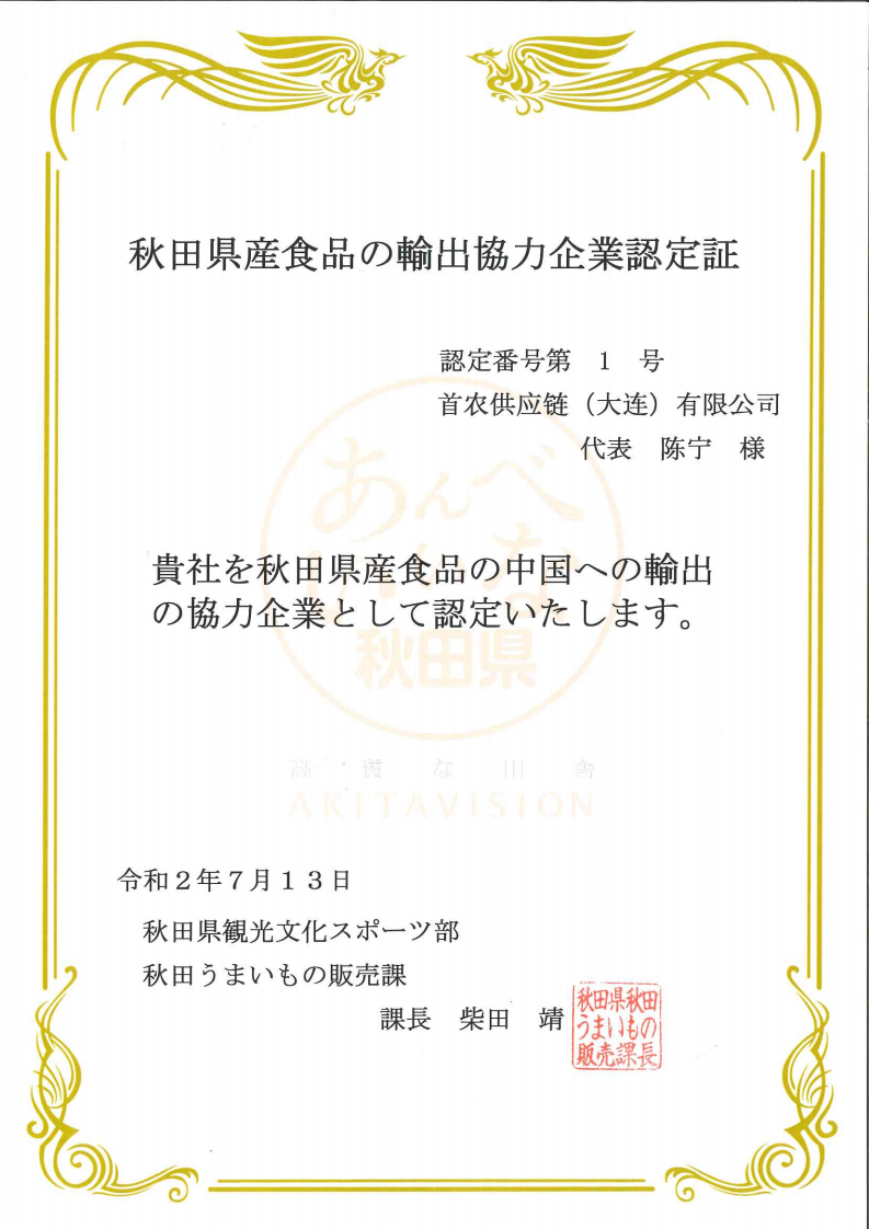 【香港商報網訊】日前,首農供應鏈(大連)有限公司收到了日本秋田縣旅遊文化體育部頒發的秋田縣食品出口合作企業認定書,正式確定了與該縣在產品對華出口及市場推廣業務上的合作關係。這是秋田縣為擴大當地產品出口首次向外國企業頒發出口合作企業認定書。