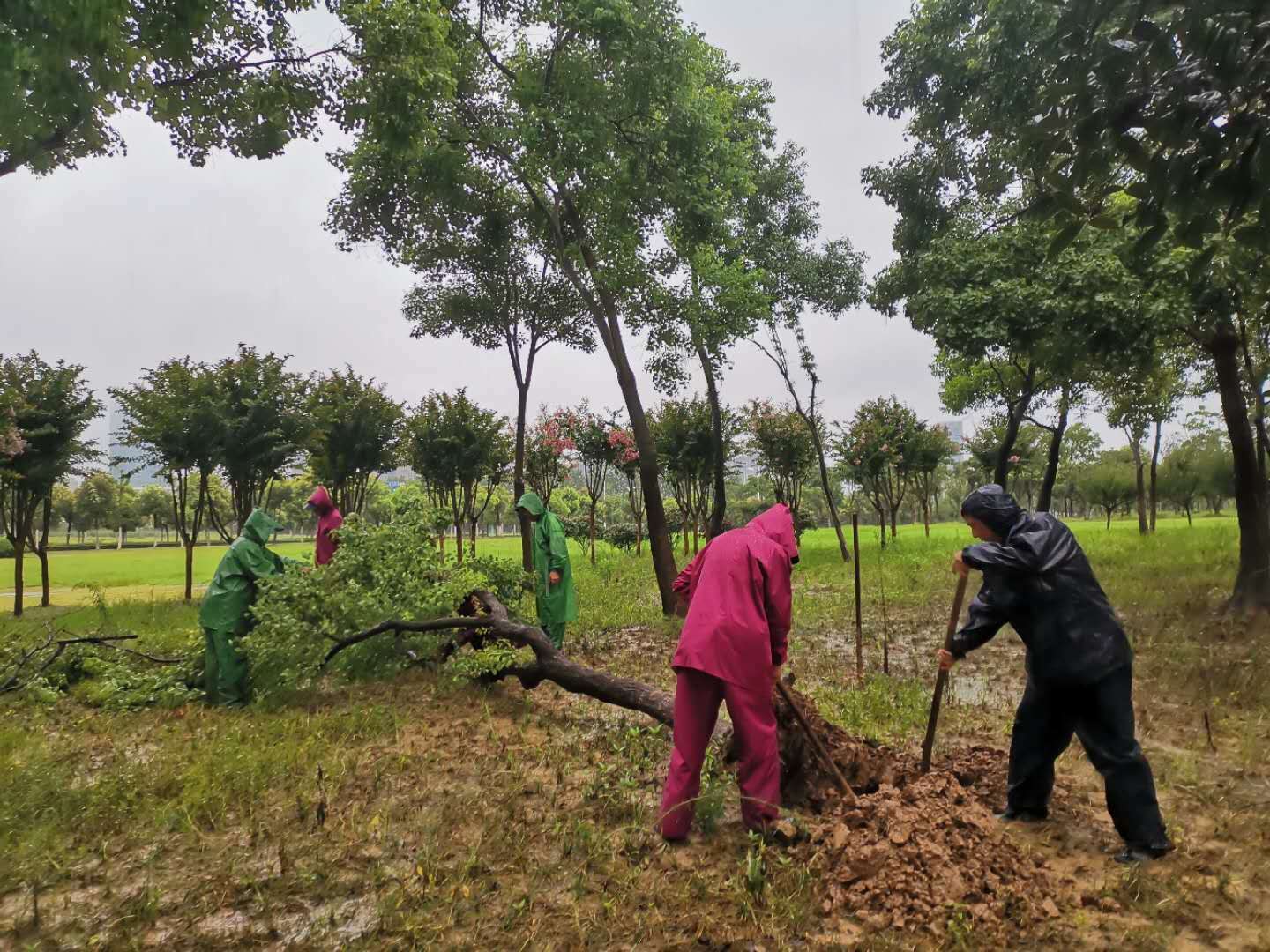 7時,巡邏隊員接到指令,王咀湖公園出現樹木倒伏現象。綠化搶險工人立刻帶着油鋸、鐵鍬第工具第一時間趕赴現場,合力將倒樹扶正並打上支撐樁固定,經過一個多小時努力順利完成應急工作,結束後及時清運斷枝棄料,保證工完料盡。