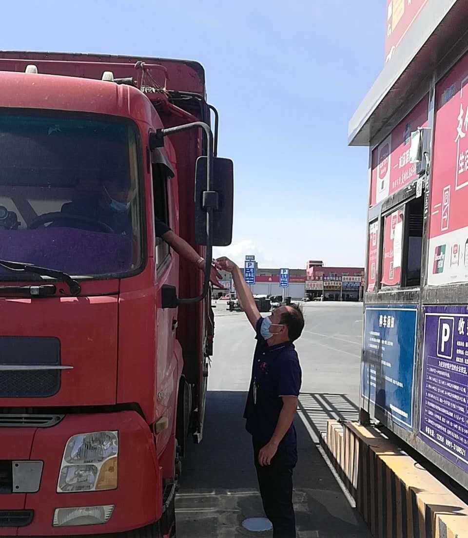 工作人員為大貨司機進行體溫檢測(圖片由經開區(頭區)新聞中心祁葉青提供)