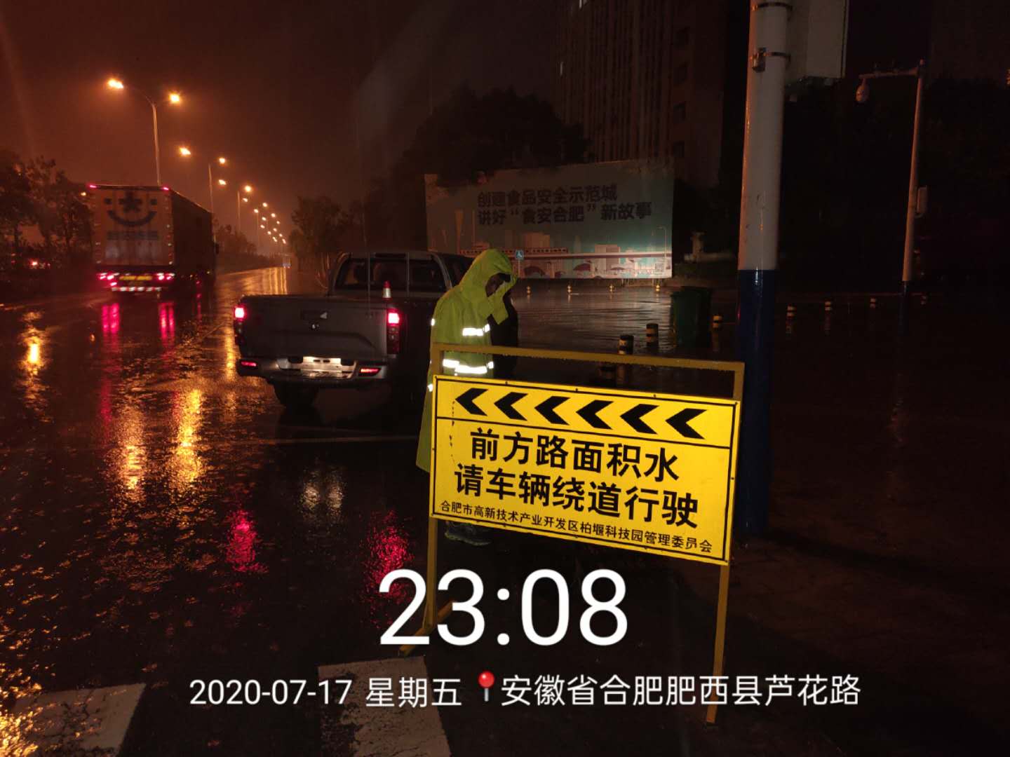 「明珠大道與集賢路交口路面無積水,明珠大道與蘆花路交口路面無積水,杭埠路與寧西路交口路面無積水,創新大道鐵路橋下穿暫無積水,銘傳路與櫻花路交口路面暫無積水……」7月17日深夜23點,各巡查小組相繼發來實時路況積水情況、車輛通行信息以及現場人員值守圖片。