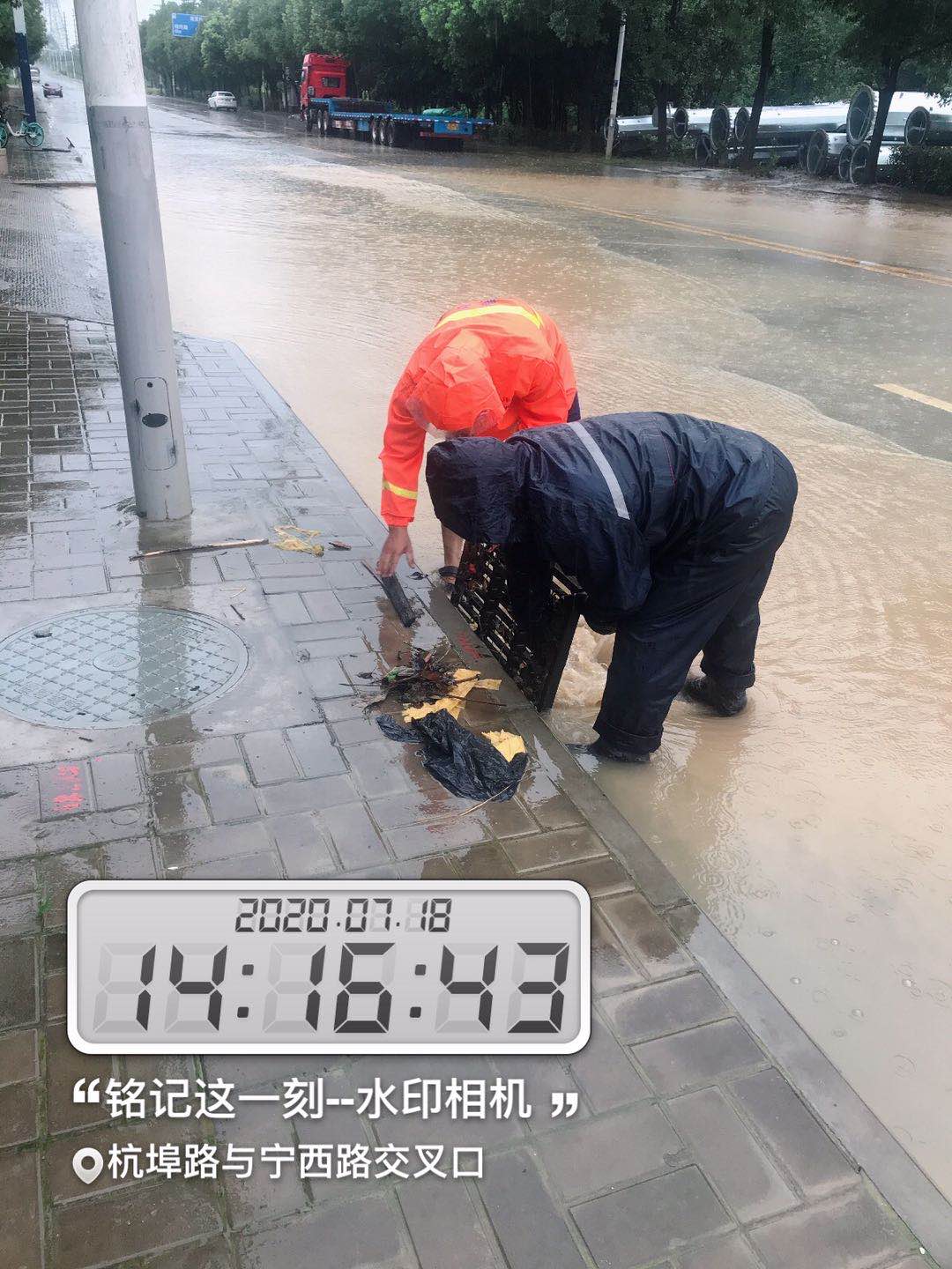 「永和路柏堰湖西出口道路積水,窨井蓋已打開,沒有警示牌,已跟市政公司聯繫……」,7月18日凌晨1點12分,永和路值守人員打開窨井蓋,用巡查車輛進行臨時維護。