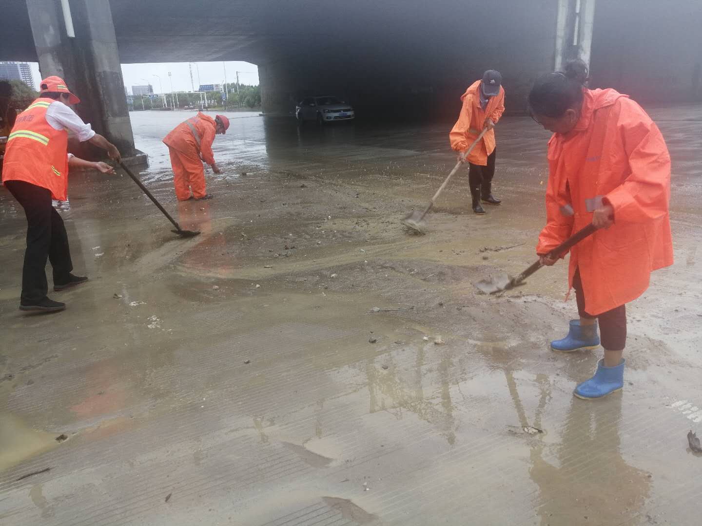 創新大道下穿橋路面被暴雨衝擊的泥沙和垃圾,保潔人員在用鐵鍬鏟,用掃帚掃…… 渾身上下濕漉漉的,早已分不清楚是雨水還是汗水了。此時,他們雖然已經飢腸轆轆,但是肩頭的責任卻讓他們堅持再堅持……