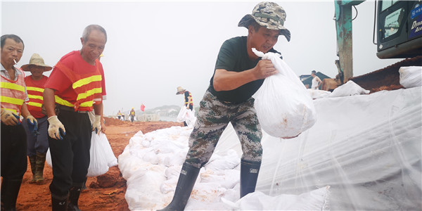 王小龍(右二)在大堤上鋪墊防水彩布 陶貴攝