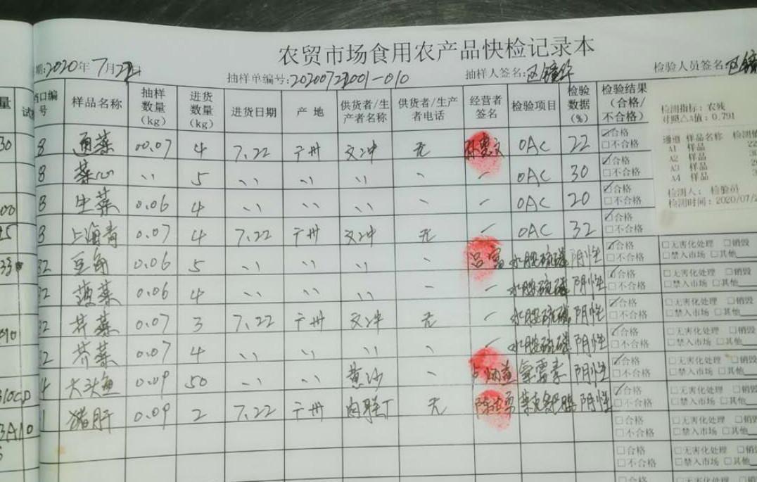 「隨機抽檢,麻煩協助配合一下……」走近一家經營葉類蔬菜的檔口,丘家軍和一名身穿「食品抽檢」背心的工作人員,隨機在菜攤上選取了長豆角、芹菜、菠菜、芥菜等4種蔬菜,並讓攤主在《食用農產品快速檢測抽樣工作單》上簽字。