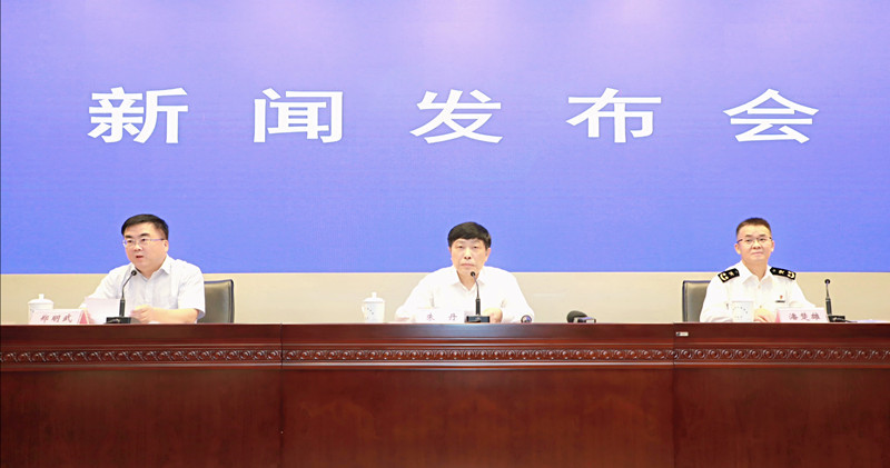 發佈會現場,左起:安徽省委宣傳部副部長、省政府新聞辦主任鄭明武主持發佈會,省商務廳副廳長朱丹,合肥海關副關長潘楚雄先後介紹相關情況並回答記者提問 (孫軍/攝)