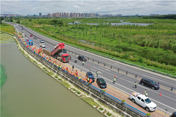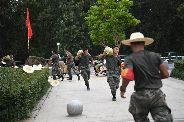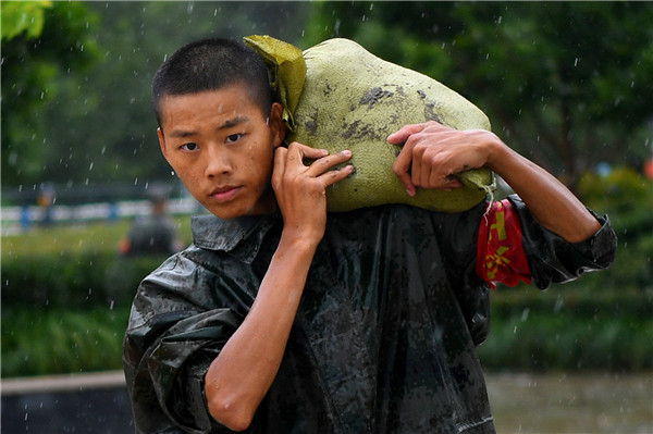 7月23日下午,在環湖大道義城街道段,中國解放軍某部隊攻堅勁旅的士兵們,正在爭分奪秒加固沿岸防浪牆(李文琦/攝)