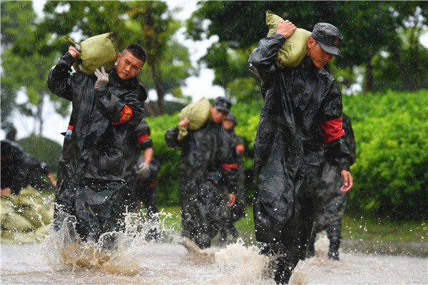 7月24日,合肥市環湖北路義城街道段紅旗獵獵,合肥濱湖國家森林公園次入口至馬家渡橋段的6公里大堤上,東部陸軍某部400餘名官兵冒雨而戰,搶築防浪堤。(謝文君、杜靜/攝)