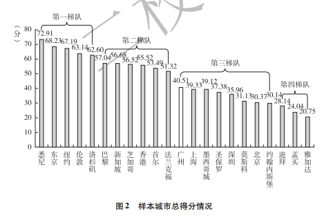 廣州社科院課題組對這22個樣本城市根據各自總得分可以劃分為四個梯隊:悉尼、東京、紐約、倫敦等城市屬於第一梯隊;巴黎、新加坡、芝加哥、中國香港等城市屬於第二梯隊;廣州、上海、墨西哥城等城市屬於第三梯隊;杜拜、孟買、雅加達等城市屬於第四梯隊。