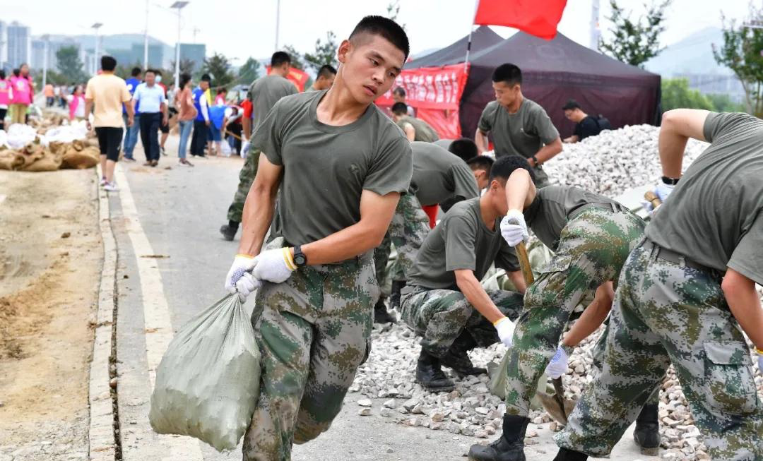 烈日下,身穿迷彩服的部隊官兵肩扛手提,揮汗如雨,緊張地填裝沙石袋,在安徽巢湖大堤西壩口牌坊至雙橋河堤段構築長1.5公里、高1.2米的「防浪牆」