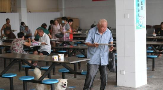 在安徽巢湖柘皋中學安置點,村民在食堂享用免費發放的晚餐