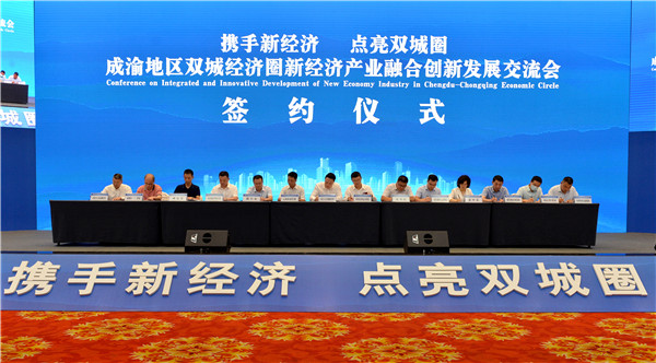 會議現場簽約新經濟領域相關合作項目14個,總投資59.67億元。其中,招商項目7個、投資金額41.6億元,包括川南人工智能算力中心項目、智慧汽車文旅城項目、手機遊戲程序研發項目、新能源商用車交易城項目、渝威國際農批冷鏈城項目、內自綠色食材網絡供應鏈平台項目、互聯網+農產品物流批發市場(二期)項目;融資項目7個,貸款(授信)金額18.07億元。