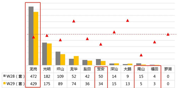 據Q房網監測顯示,7月13日-7月19日新政當周,深圳樓市出現了新變化。其中,寶安、南山、福田等區域成交環比下跌明顯,南山區下跌了約67%,但是龍崗卻以絕對優勢拿下住宅成交套數第一名,亮眼的數據背後是南山、福田等區域改善需求和剛需首次置業需求的湧入。