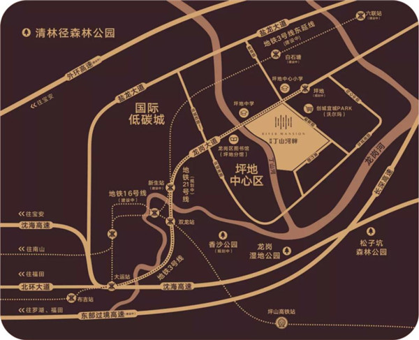 從地理位置上看,創城丁山河畔處於龍崗中心城與國際低碳城雙核交匯處,雙享龍崗中心城和國際低碳城的區域利好。
