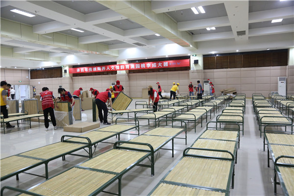 【香港商報網訊】7月27日上午,合肥一中學術報告廳內活躍着一群「紅馬甲」,他們正緊張有序的搬運儲物箱等生活物資,而1000多平方米的報告廳內,已經整整齊齊地擺滿了310張床。