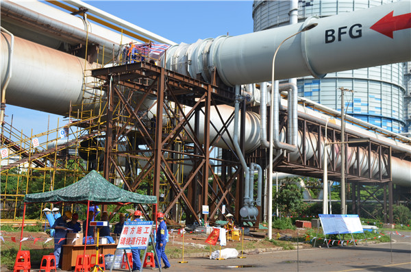 管道接口作業是指利用介質管網停氣檢修時間,將新建管道與原介質管網連通,新建管道安裝到第一次閥門或水封,具備輸送介質的條件,閥門或水封后新建管道施工不影響正常生產。中國五冶承建的湛江鋼鐵三高爐系統項目全廠燃氣及熱力工程共計52個接口,前期已經完成6個,為保障後續施工及生產,此次需在28小時內同時完成7個接口作業任務,包括3個高爐煤氣接口,2個壓縮空氣接口和2個蒸汽接口。其中,高爐煤氣管道接口作業屬於湛江鋼鐵7月定修期間的重點項目,也是湛江鋼鐵今年首次大管徑煤氣接口作業。
