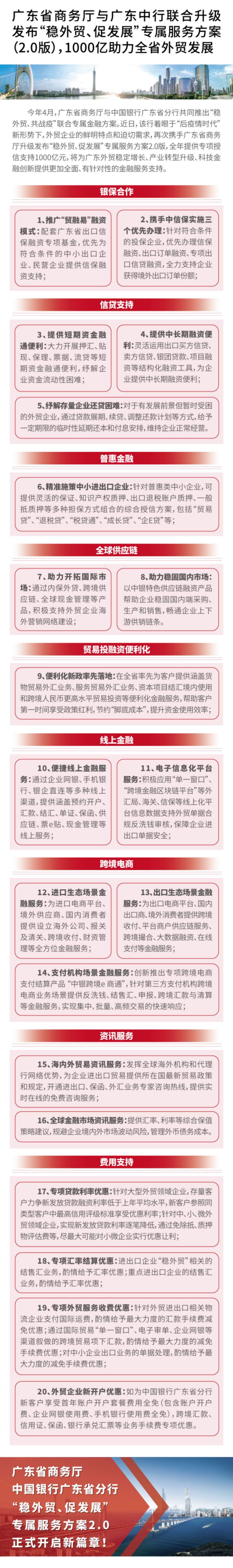 記者獲悉,廣東中行還與廣東省商務廳、中國進出口信用保險公司廣東分公司共同簽署「貿融易」專項合作協議,並在今年4月與廣東省商務廳共同推出的「穩外貿、共戰疫」專屬金融服務方案基礎上,升級發佈2.0版「穩外貿、促發展」綜合服務方案,創新推出20項重點產品及金融服務舉措,預計年內為外貿企業提供專項授信支持1000億元,將為廣東外貿穩定增長、產業轉型升級、科技金融創新提供更加全面、更有針對性的金融服務支持。