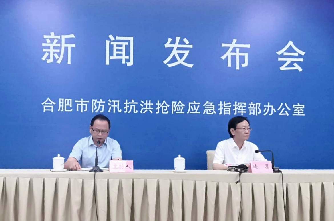 新聞發佈會現場,合肥市人民政府新聞辦公室主任王立群(左)主持發佈會,合肥市政府副秘書長、市防指辦第一主任徐昌介紹相關情況(孫軍/攝)