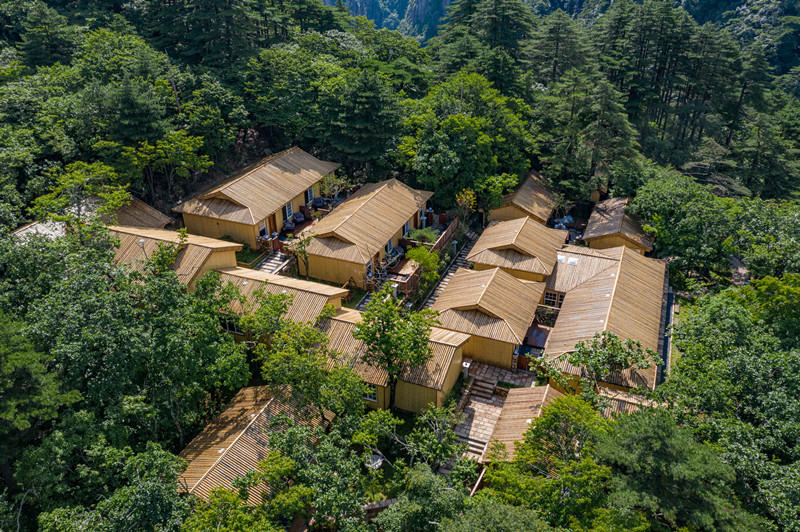 “雲居”:房間一棟棟地,在松林之間。整個建築為純竹木結構,簡約、雅致、環保。中間採用美式原木結構,解決山上建築隔音、防潮、保溫難題。客房內設施齊全,帶來向自然靠近的旅居體驗。
