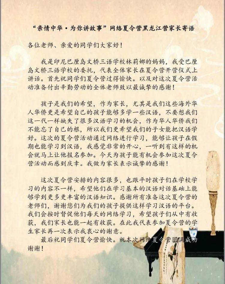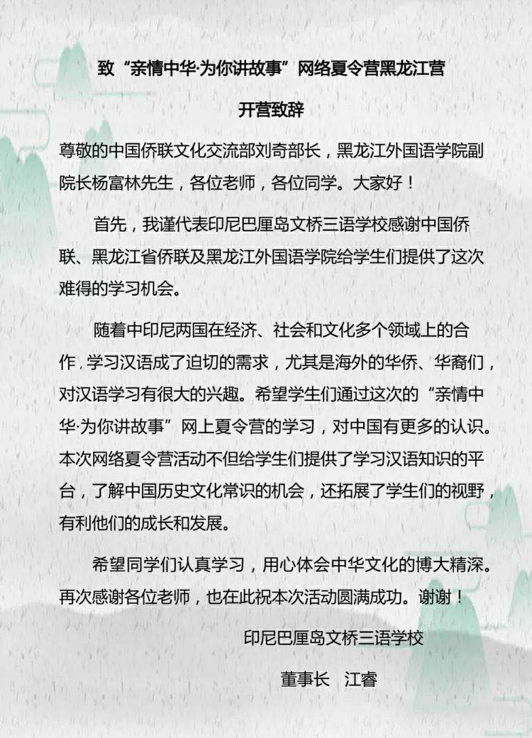 印尼峇里島文橋三語學校董事長江睿在致辭中向主辦方中國僑聯,承辦方黑龍江省僑聯、黑龍江外國語學院表示感謝。他說,「親情中華·為你講故事」網上夏令營活動不但給學生們提供了學習漢語知識的平台,了解中國歷史文化常識的機會,還拓展了學生們的視野,有利他們的成長和發展。希望同學們認真學習,用心體會中華文化的博大精深。同時預祝本次活動圓滿成功。