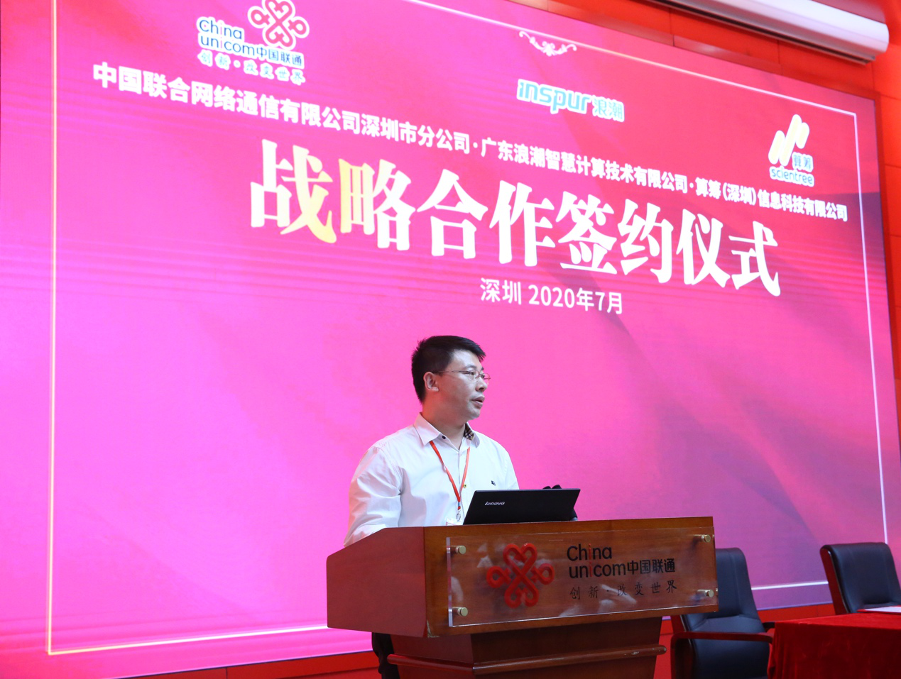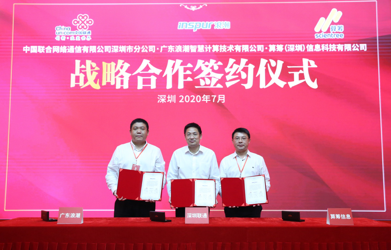 【香港商報網訊】記者 蘇偉 報導:7月28日,算籌(深圳)信息科技有限公司與深圳聯通、廣東浪潮智慧計算技術有限公司簽署戰略合作框架協定。算籌信息總經理李海鵬、特邀嘉賓深圳市政協原副主席,《時代商家》雜誌社社長、總編輯吳井田、深企聯會長助理朱興勃、副總經理袁小楓、副總經理李新強、副總經理兼CTO袁博;深圳聯通黨委書記、總經理張海濤,副總經理廖海明;浪潮集團副總裁王閏生,廣東區副總經理毛憲陽等領導出席並見證簽約。算籌信息總經理李海鵬、深圳聯通副總經理廖海明、廣東浪潮深圳辦事處總經理朱駿代表三方簽署戰略合作協定。