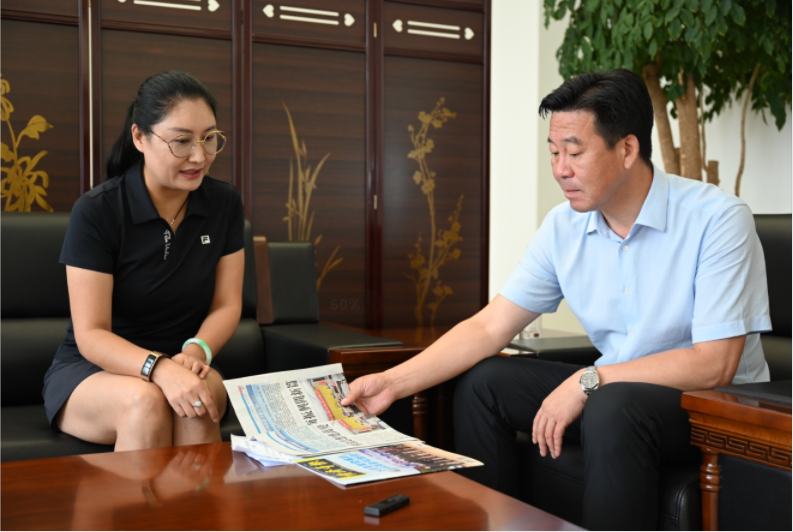 香港商報吉林省辦事處主任冀文嫻(左)向德惠市委書記左毅(右)介紹本報對長春的宣傳報道
