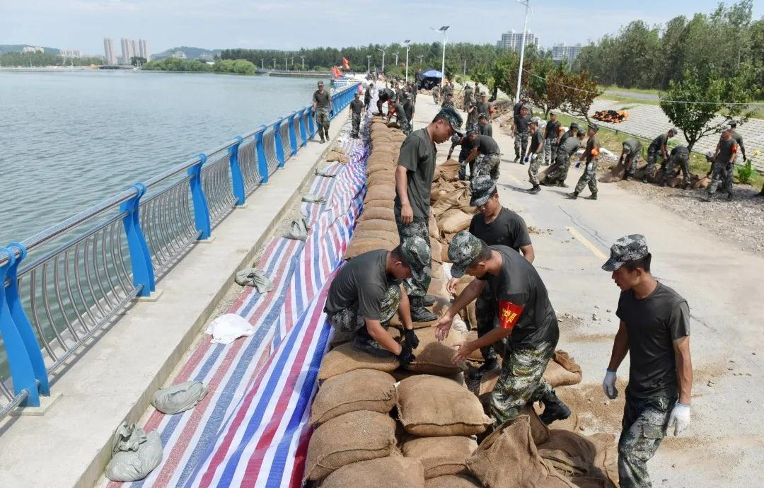 在降高現場,大家頂着烈日,在室外高溫環境下,將一袋袋裝滿石料的麻袋抬到大堤的另一側,並將撒落一地的石子及時清掃乾淨。經過兩個半小時的奮戰,上午10點半,前期構築的防浪牆被成功降高0.6米。