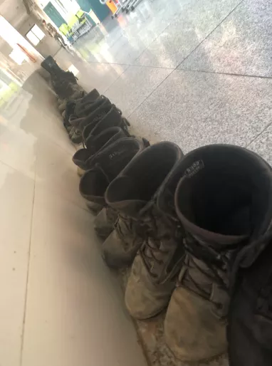宿舍門前,一排排戰靴整齊地排放在門口。