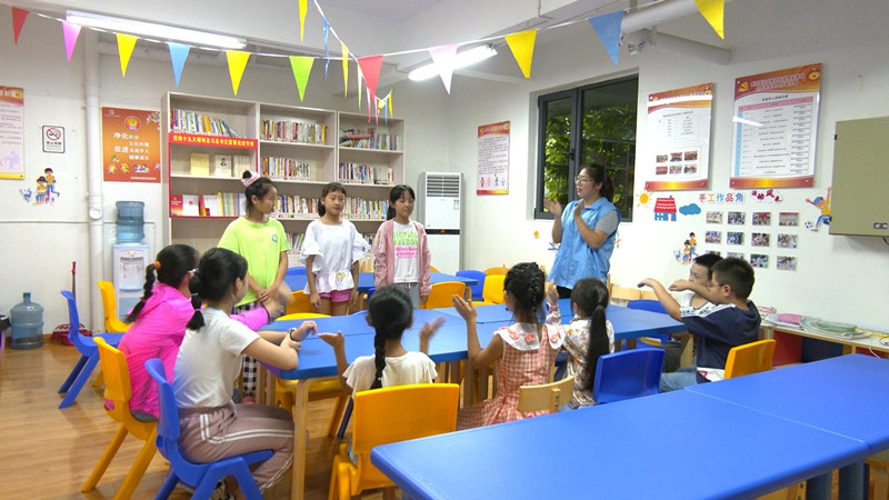 孩子們來到這裏,在社區工作人員和志願者的指導下完成學校老師佈置的家庭作業之餘,還可以在這裏閱讀課外圖書,動手做科普實驗,和老師同學們做互動遊戲……“在這裏,我們主要是輔導孩子完成學校裏佈置的暑假作業,其次再帶孩子們做一些遊戲,帶他們瞭解一些課外知識。比如說垃圾分類、暑期溺水安全、交通安全以及火災地震的一些應對的自救的方式等方面的知識。”