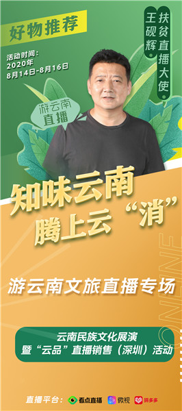 【香港商報網訊】近日,演員王硯輝、楊迪、李智楠,湖南衛視主持人劉燁、梁田等眾多明星,紛紛為8月14—16日將在深圳舉辦的2020年彝族火把節「知味雲南·騰上雲『消』」雲南民族文化展演暨「雲品」直播銷售(深圳)活動助力「打call」,一場意義非凡的雲南「消費扶貧」行動正在深圳悄悄拉開帷幕。