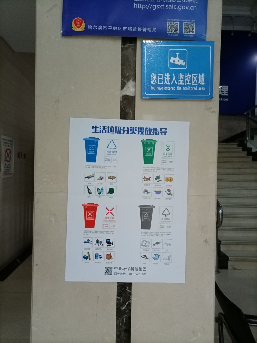 哈爾濱新區平房片區市場局按照哈爾濱市最新垃圾分類標準設置了垃圾分類箱;結合創城工作,督促轄區東輕市場和綜合市場等三家市場,按最新標準更新原有垃圾分類宣傳欄。同時指導轄區其它兩家室內攤區積極落實垃圾分類工作要求,補充完善垃圾分類設施。