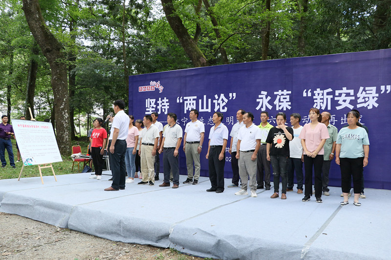 “上個月我們村發佈了《關於在全村禁用除草劑的通告 》,今天借此機會我們再次完善新安源村《村規民約》,希望通過大家集體努力,保護新安源頭大好山水,為下游富庶的浙江提供清澈甘甜的清流,更通過’新安源‘綠色品牌帶動全村村民致富增收,讓綠水青山變成我們的金山銀山。”在“堅持’兩山論‘永葆’新安綠‘主題活動現場,鶴城鄉新安源村黨支部書記李發權帶領當地黨員和村民共同宣讀《村規民約》,在場的鄉親們紛紛承諾並宣誓:”我們要保護好生態,不打除草劑……“