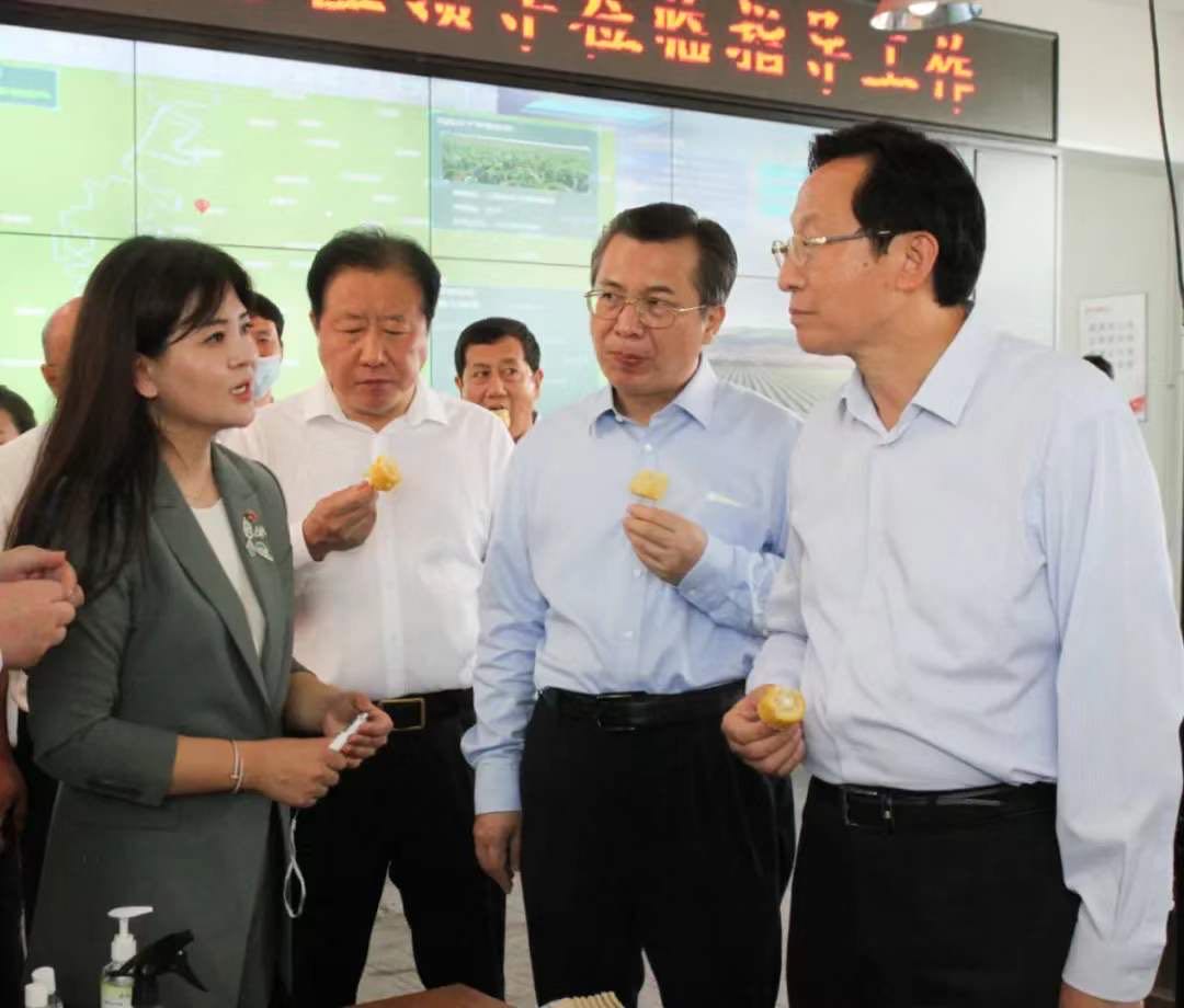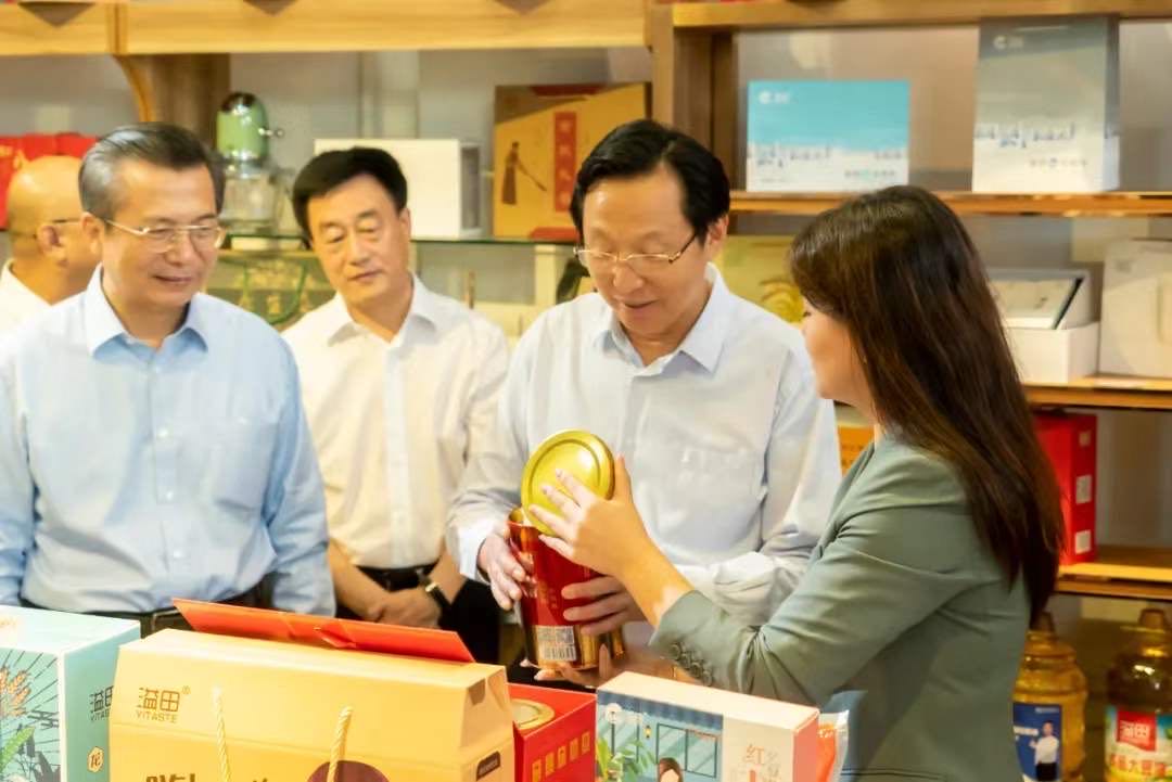 韓長賦一行深入了解公司的產業運營情況,詳細聽取了黑龍江省和糧農業有限公司董事長張芳在產業方向、產品種類、企業文化等方面的匯報,並參觀了雜糧生產車間、理化實驗室、種植基地遠程智能監控系統、和糧品控中心、產品展示中心、電商運營中心、新媒體直播中心等,從田間源頭記錄稻苗長勢,通過基地遠程智能監控系統實時監測、展示第一產業基地情況。當見到和糧品控中心,嚴格把控和糧的「進出管卡」,以高標準、嚴要求約束企業,以高於行業標準把控和糧全產品體系,為百姓舌尖安全築牢一道道安全防線時,韓長賦不時點讚。
