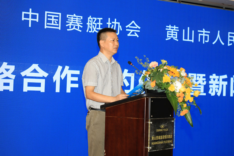簽約儀式上,黃山市人民政府副市長程紅與中國賽艇協會主席劉愛傑簽署戰略合作協議;黃山市體育局局長夏建萍與中國賽艇協會執行副主席陳春新簽署中國賽艇大師系列賽承辦協議,與上海美帆遊艇俱樂部有限公司(集團)董事長時立憲簽署合作備忘錄。