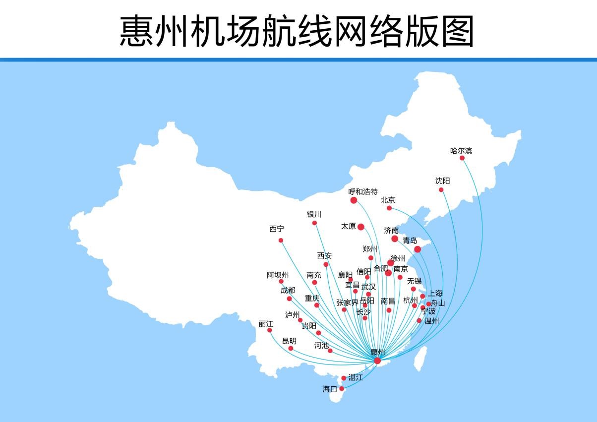 自8月18日起,惠州機場航線將通達國內42個航點,分別為北京(首都機場/大興機場)、上海、成都、西安、南京、瀋陽、長春、杭州、貴陽、昆明、武漢、重慶、濟南、海口、青島、長沙、呼和浩特、海拉爾、南昌、鄭州、哈爾濱、無錫、合肥、溫州、寧波、銀川、西寧、太原、張家界、麗江、紅原、襄陽、湛江、宜昌、岳陽、信陽、徐州、舟山、河池、南充、瀘州。 (盧偉 秦海偉)
