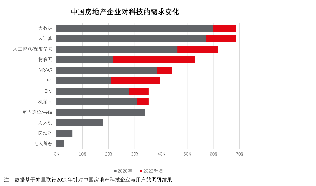 中國有望成為率先開啟5G時代的國家之一,這意味着物聯網和人工智能的發展將駛入「加速帶」,技術應用的邊際成本也將迅速降低。仲量聯行調研結果同樣顯示,中國房地產企業對於物聯網、5G和人工智能的需求將在未來兩年內顯著上升。從長期來看,隨着中國數碼化基礎設施建設的推進,數據安全法律法規的完善,企業信息安全管理水平的提升,房地產行業對新興科技的總體需求有望進一步擴大。