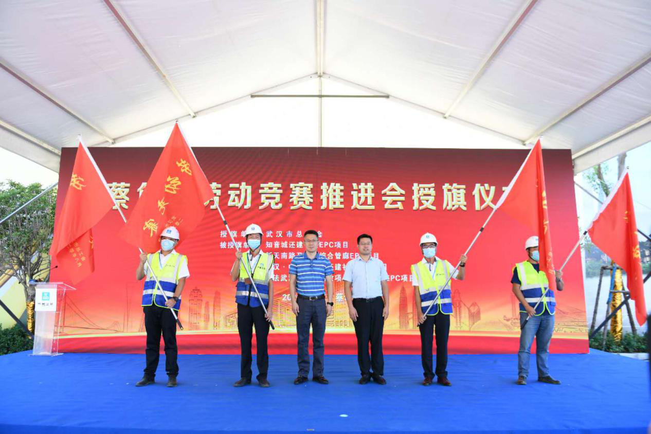 蔡甸區委常委、副區長黃江波與武漢市總工會黨組成員、副主席劉斌向施工代表授發勞動競賽旗幟