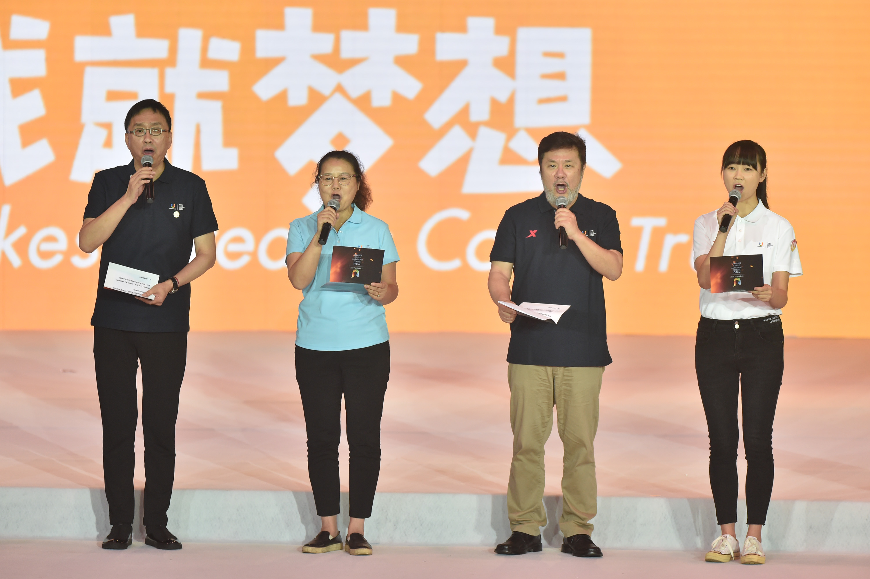 現場,成都大運會開閉幕式總導演陳維亞和甲丁、運動員代表張山、優秀大學生代表共同宣讀主視覺設計理念,宣佈成都大運會主視覺全球發佈。