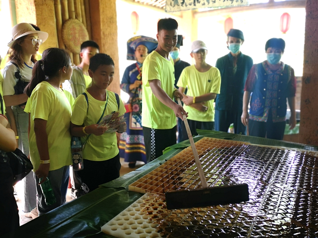 活動現場,在百名研學游體驗官的見證下,莘莘學子們背起行囊,開啟花山小紅人探險家秘境一日游體驗之旅,一起探索世界文化遺產,揭秘岩畫千年未解之謎,走進壯族民俗古村落,體驗傳統古法紅糖製作、非遺壯族天琴、非遺壯布蠟染及非遺傳承活字印刷等精品課程。