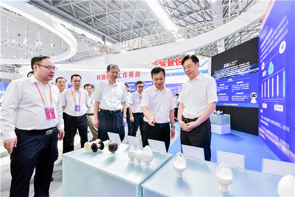 廣西壯族自治區黨委副書記孫大偉(右一)及廣西壯族自治區副主席費志榮(右三)參觀展區。廣西科技廳供圖