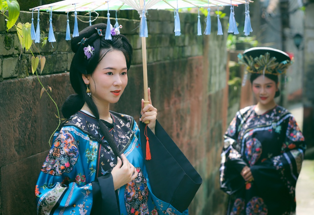 活動現場,穿着不同形制明、清服飾的模特閃亮登場,她們或執油傘、或持摺扇,伴着空靈典雅的音樂款款走來,婀娜裊裊的身姿盡顯優雅。服飾秀依託南社自然風景,表演舞台延伸至池塘上,為觀眾帶來一場美妙絕倫的表演,也充分展示了中國傳統服飾文化與水映古村的魅力以及服飾歷史發展變遷。