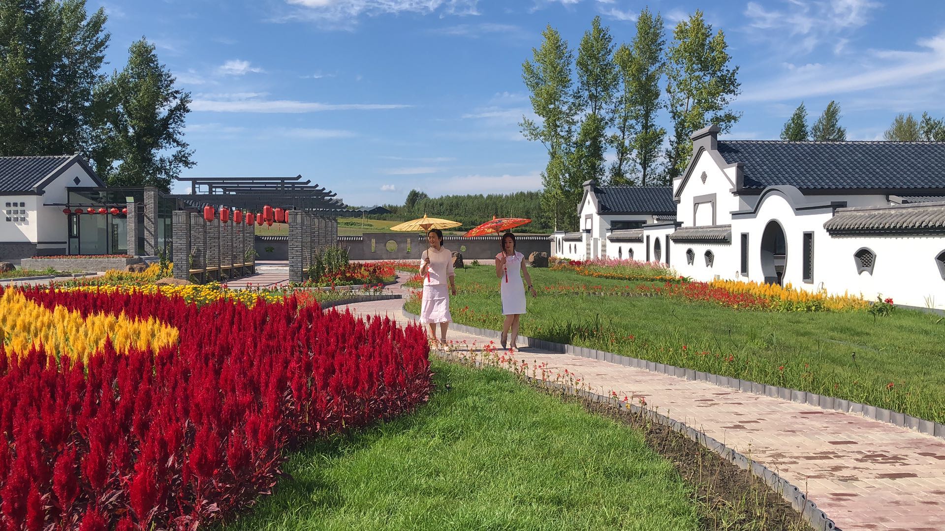 8月16日,記者走進尚在建設當中的寒地中草藥小鎮,帶有濃郁中藥特色的大門上醒目的「寒地中草藥小鎮」七個繁體字,仿佛穿越到古代,改造後的「新中式」民宿白牆灰瓦錯落有致,民宿門前新植樹木桃紅柳綠,剛栽的花草中草藥競相開放,建築工人正在如火如荼的圍牆砌築。