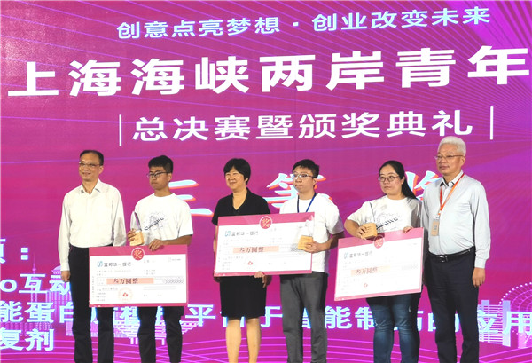 市台辦主任李文輝與金山區區長劉健為獲得一等獎選手頒獎。劉健在致辭中表示,今天的金山,創業空間更加廣闊,創業平台更加優質,創業環境更加優越,致力於為廣大創業青年在打拼路上‘點亮一盞燈’、‘撐好一把傘’、‘當好一個港灣’。歡迎兩岸青年創客積極參與青創大賽,期待更多兩岸青年才俊在金山這片熱土上放飛夢想、實現價值,成就人生。
